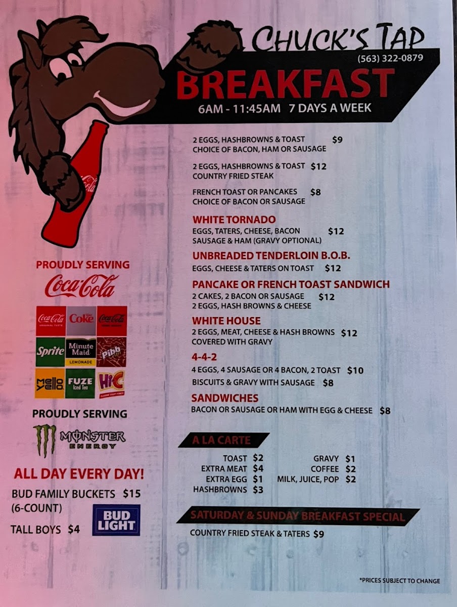 Whether you're savoring crispy bacon and fluffy eggs or indulging in their renowned hash browns, Chuck's Tap promises a satisfying culinary adventure. Don’t miss out on this beloved local treasure!